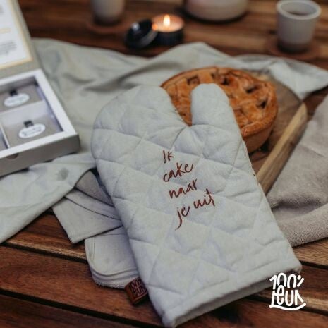 Bij 100% LEUK gaat het om de boodschap. Een cadeau waar de ontvanger een glimlach van krijgt. Deze ovenwant is daar een mooi voorbeeld van. Door de toepasselijke boodschap 'ik cake naar je uit' op de ovenwant is het een geschikt cadeau voor iemand die je al een tijdje niet meer hebt gezien.