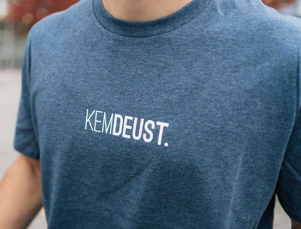 Blauwe T-shirt met opschrift KEMDEUST. voor volwassenen. Als cadeau of gewoon voor jezelf. Recht uit Antwerpen. Met trots voor het dialect.