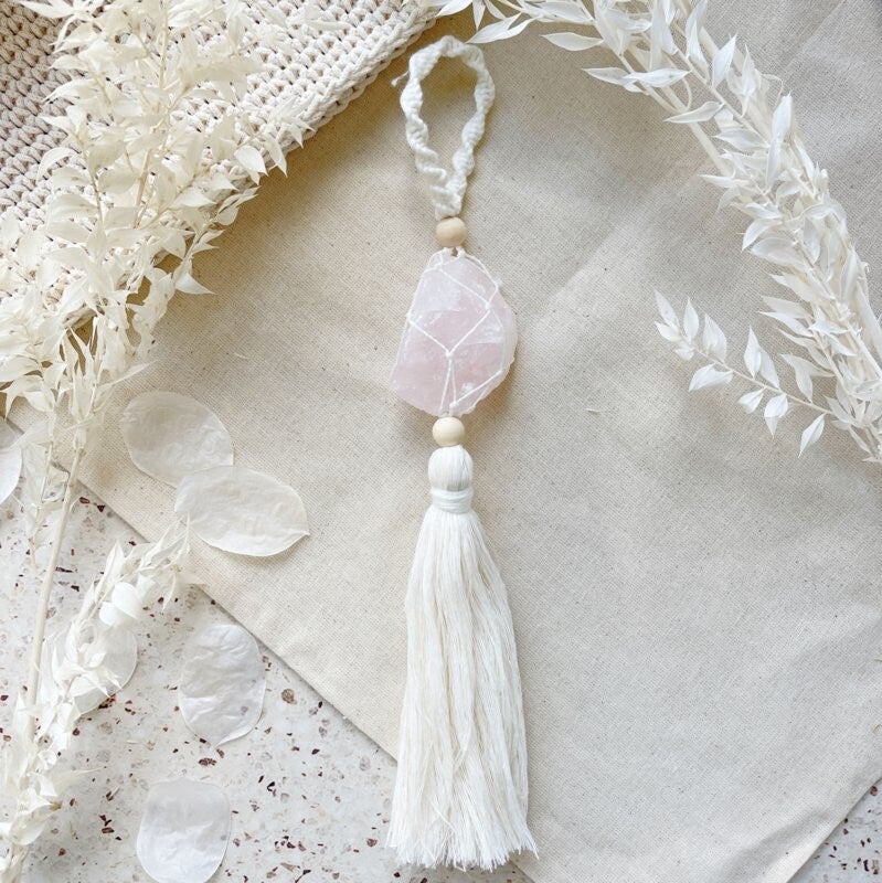 Yesss, Boho vibes all over! Een prachtig, mooi stuk Rozenkwarts. Met de hand gehaakte Room Jewel en klaar om heel veel liefde, gezelligheid en een vleugje roze te brengen.
